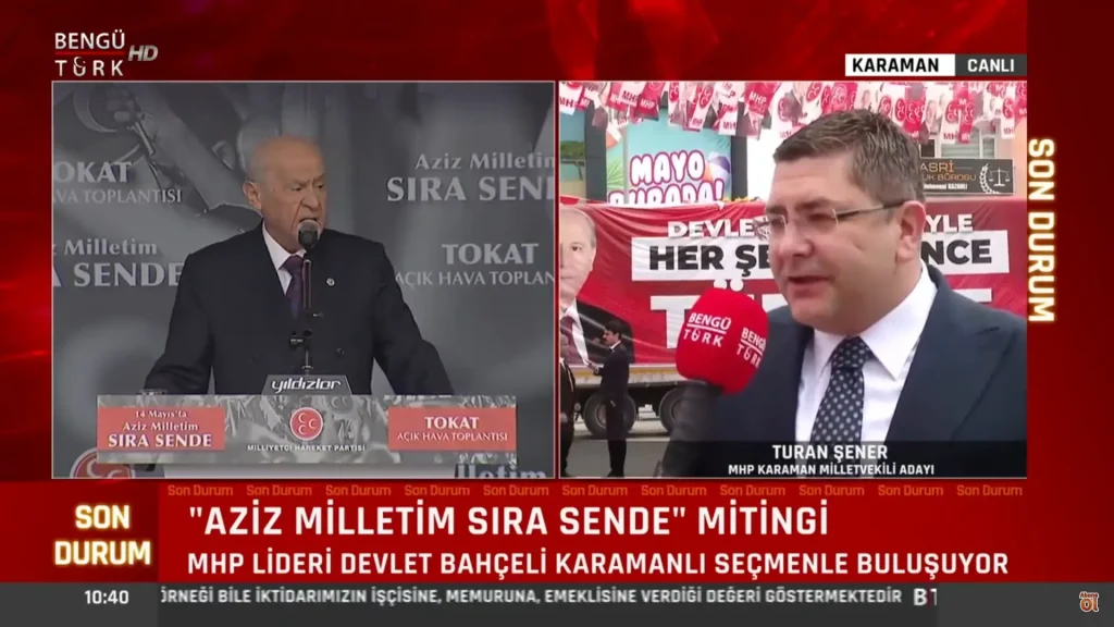 MHP Karaman Milletvekili Adayı Dr. Turan Şener, MHP Karaman Mitingi Öncesi BengüTürk Tv’nin yayın konuğu oldu.