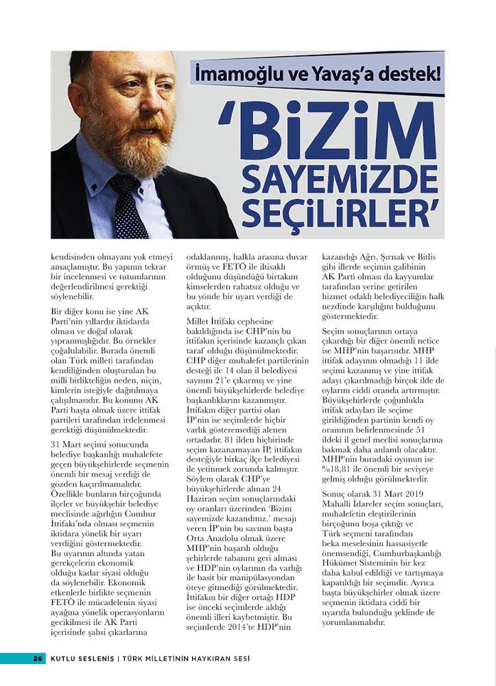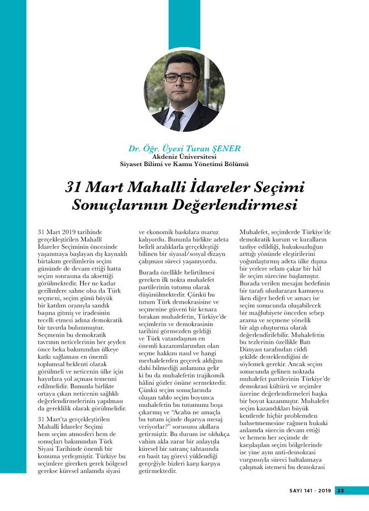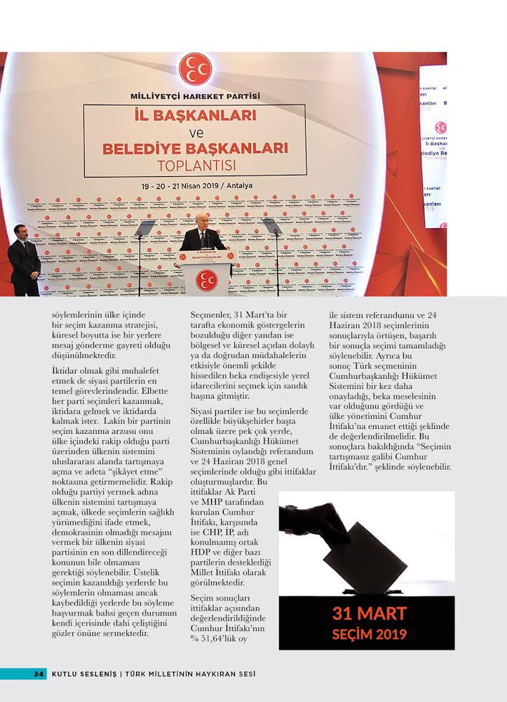 31 Mart 2019 tarihinde gerçekleştirilen Mahallî İdareler Seçiminin öncesinde yaşanmaya başlayan dış kaynaklı birtakım gerilimlerin seçim gününde de devam ettiği hatta seçim sonrasına da aksettiği görülmektedir. Her ne kadar gerilimlere sahne olsa da Türk seçmeni, seçim günü büyük bir katılım oranıyla sandık başına gitmiş ve iradesinin tecelli etmesi adına demokratik bir tavırda bulunmuştur. Seçmenin bu demokratik tavrının neticelerinin her şeyden önce beka bakımından ülkeye katkı sağlaması en önemli toplumsal beklenti olarak görülmeli ve neticenin ülke için hayırlara yol açması temenni edilmelidir. Bununla birlikte ortaya çıkan neticenin sağlıklı değerlendirmelerinin yapılması da gereklilik olarak görülmelidir.
