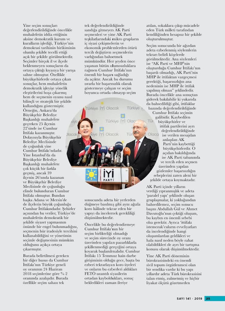 Burada belirtilmesi gereken bir diğer husus da Cumhur İttifakının Türkiye geneli oy oranının 24 Haziran 2018 seçimlerine göre % 2 oranında azalışıdır. Burada özellikle seçim sahası tek tek değerlendirildiğinde sandığa gitmeyen AK Parti seçmenleri ve yine AK Parti teşkilatlarındaki mikro grupların iç siyasi çekişmelerin ve ekonomik problemlerden ötürü tercih değiştiren seçmenlerin varlığından bahsetmek mümkündür. Her şeyden önce yaşanan bütün olumsuzluklara rağmen Cumhur İttifakının önemli bir başarı sağladığı da açıktır. Ancak bu durumu ısrarla bir başarısızlık olarak göstermeye çalışan ve seçim boyunca ortada olmayıp seçim sonucunda adeta bir yerlerden düğmeye basılmış gibi aynı ağızla koro hâlinde tekrar eden bir yapıyı da incelemek gerekliliği düşünülmektedir.