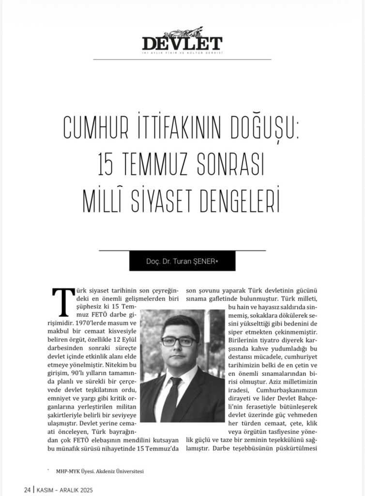 Türk siyaset tarihinin son çeyreğindeki en önemli gelişmelerden biri şüphesiz ki 15 Temmuz FETÖ darbe girişimidir. 1970’lerde masum ve makbul bir cemaat kisvesiyle beliren örgüt, özellikle 12 Eylül darbesinden sonraki süreçte devlet içinde etkinlik alanı elde etmeye yönelmiştir. Nitekim bu girişim, 90’lı yılların tamamında planlı ve sürekli bir çerçevede devlet teşkilatının ordu, emniyet ve yargı gibi kritik organlarına yerleştirilen militan şakirtleriyle belirli bir seviyeye ulaşmıştır. Devlet yerine cemaati önceleyen, Türk bayrağından çok FETÖ elebaşının mendilini kutsayan bu münafık sürüsü nihayetinde 15 Temmuz’da son şovunu yaparak Türk devletinin gücünü sınama gafletinde bulunmuştur. Türk milleti, bu hain ve hayasız saldırıda sinmemiş, sokaklara dökülerek sesini yükselttiği gibi bedenini de siper etmekten çekinmemiştir. Birilerinin tiyatro diyerek karşısında kahve yudumladığı bu destansı mücadele, cumhuriyet tarihimizin belki de en çetin ve en önemli sınamalarından birisi olmuştur. Aziz milletimizin iradesi, Cumhurbaşkanımızın dirayeti ve lider Devlet Bahçeli’nin ferasetiyle bütünleşerek devlet üzerinde güç vehmeden her türden cemaat, çete, klik veya örgütün tasfiyesine yönelik güçlü ve taze bir zeminin teşekkülünü sağlamıştır. Darbe teşebbüsünün püskürtülmesi tek başına bir vaka olmanın ötesine geçerek geleceğe yönelik yeni bir siyaset mimarisini de talep eden güçlü bir kitlesel çağrıya dönüşmüştür. İşte Cumhur İttifakı bu çağrıya karşılık bir cevap mahiyetinde inşa olunmuştur.