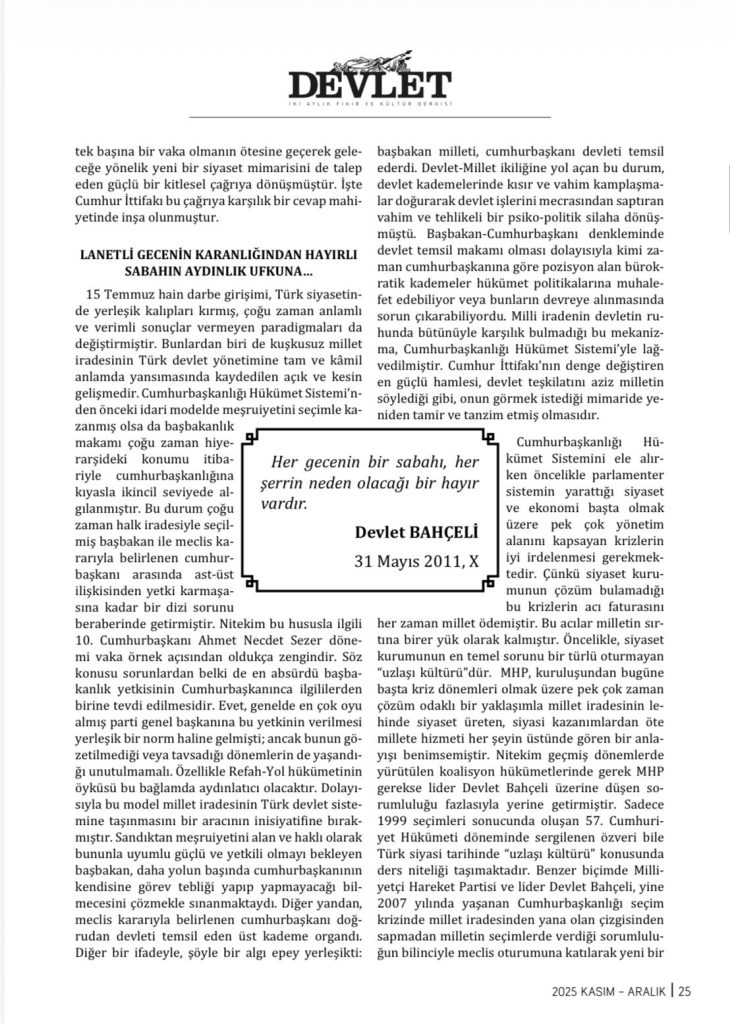 15 Temmuz hain darbe girişimi, Türk siyasetinde yerleşik kalıpları kırmış, çoğu zaman anlamlı ve verimli sonuçlar vermeyen paradigmaları da değiştirmiştir. Bunlardan biri de kuşkusuz millet iradesinin Türk devlet yönetimine tam ve kâmil anlamda yansımasında kaydedilen açık ve kesin gelişmedir. Cumhurbaşkanlığı Hükümet Sistemi’nden önceki idari modelde meşruiyetini seçimle kazanmış olsa da başbakanlık makamı çoğu zaman hiyerarşideki konumu itibariyle cumhurbaşkanlığına kıyasla ikincil seviyede algılanmıştır. Bu durum çoğu zaman halk iradesiyle seçilmiş başbakan ile meclis kararıyla belirlenen cumhurbaşkanı arasında ast-üst ilişkisinden yetki karmaşasına kadar bir dizi sorunu beraberinde getirmiştir. Nitekim bu hususla ilgili 10. Cumhurbaşkanı Ahmet Necdet Sezer dönemi vaka örnek açısından oldukça zengindir. Söz konusu sorunlardan belki de en absürdü başbakanlık yetkisinin Cumhurbaşkanınca ilgililerden birine tevdi edilmesidir. Evet, genelde en çok oyu almış parti genel başkanına bu yetkinin verilmesi yerleşik bir norm haline gelmişti; ancak bunun gözetilmediği veya tavsadığı dönemlerin de yaşandığı unutulmamalı. Özellikle Refah-Yol hükümetinin öyküsü bu bağlamda aydınlatıcı olacaktır. Dolayısıyla bu model millet iradesinin Türk devlet sistemine taşınmasını bir aracının inisiyatifine bırakmıştır. Sandıktan meşruiyetini alan ve haklı olarak bununla uyumlu güçlü ve yetkili olmayı bekleyen başbakan, daha yolun başında cumhurbaşkanının kendisine görev tebliği yapıp yapmayacağı bilmecesini çözmekle sınanmaktaydı. Diğer yandan, meclis kararıyla belirlenen cumhurbaşkanı doğrudan devleti temsil eden üst kademe organdı. Diğer bir ifadeyle, şöyle bir algı epey yerleşikti: başbakan milleti, cumhurbaşkanı devleti temsil ederdi. Devlet-Millet ikiliğine yol açan bu durum, devlet kademelerinde kısır ve vahim kamplaşmalar doğurarak devlet işlerini mecrasından saptıran vahim ve tehlikeli bir psiko-politik silaha dönüşmüştü. Başbakan-Cumhurbaşkanı denkleminde devlet temsil makamı olması dolayısıyla kimi zaman cumhurbaşkanına göre pozisyon alan bürokratik kademeler hükümet politikalarına muhalefet edebiliyor veya bunların devreye alınmasında sorun çıkarabiliyordu. Milli iradenin devletin ruhunda bütünüyle karşılık bulmadığı bu mekanizma, Cumhurbaşkanlığı Hükümet Sistemi’yle lağvedilmiştir. Cumhur İttifakı’nın denge değiştiren en güçlü hamlesi, devlet teşkilatını aziz milletin söylediği gibi, onun görmek istediği mimaride yeniden tamir ve tanzim etmiş olmasıdır.