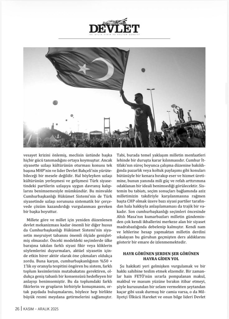 Cumhurbaşkanlığı Hükümet Sistemi, 15 Temmuz 2016’ da millet tarafından sergilenen milli duruşun necip ve mümtaz hali olan Cumhur İttifakının, yüksek bir eseridir. Cumhur İttifakı, Türk Tipi Başkanlık Sisteminden aldığı güçle emin adımlarla yoluna devam etmektedir. Bu güç Türkiye’yi “dünya üzerinde siyasetiyle, ekonomisiyle, milli dokusuyla, kardeşlik hukukuyla göz dolduran, öne çıkan yegâne ülkelerden birisi” haline getiriştir. Bu tespit Türk Milleti tarafından görülmektedir. Lider Devlet Bahçeli’nin ifade ettiği üzere “sönmüş siyaset fosillerinin tezviratlarına, çapsız tenkitlerine aldanacak yoktur. Cumhur İttifakı güçlü Türkiye’nin, lider ülkenin, bölgesinde ve küresel alanda sözü dinlenen bir devletin müjdesidir.” Bu müjde 2053’lerin 2071’lerin büyük ve müreffeh Türkiye’sinin müjdesidir. Şer Cephesi ve peşinden sürüklenenler istedikleri şekilde istedikleri yere yürünsünler, istedikleri uluslararası yapılanmalarla ilişki içinde olsunlar, “okyanus ötesinden” istedikleri kadar desteklensinler, Türk Milletinin sinesine çarpacakları muhakkaktır ve kazanan dün olduğu gibi yine Türk Milleti olacaktır.