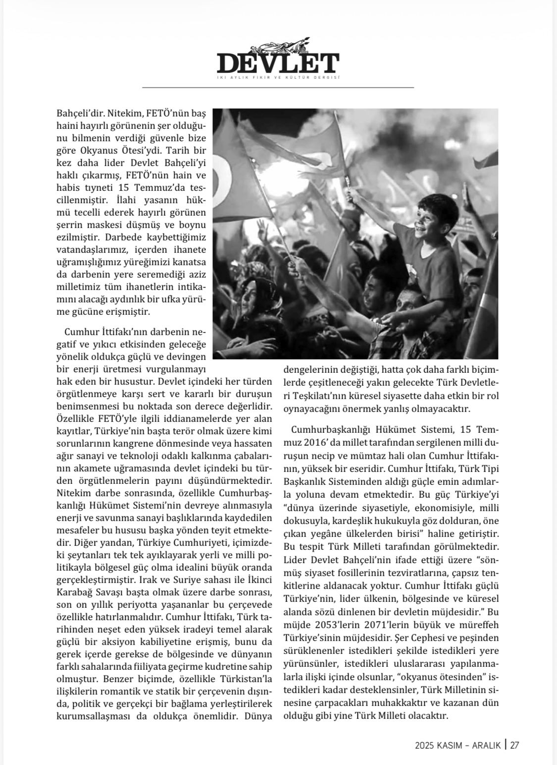 Cumhur İttifakı’nın darbenin negatif ve yıkıcı etkisinden geleceğe yönelik oldukça güçlü ve devingen bir enerji üretmesi vurgulanmayı hak eden bir husustur. Devlet içindeki her türden örgütlenmeye karşı sert ve kararlı bir duruşun benimsenmesi bu noktada son derece değerlidir. Özellikle FETÖ’yle ilgili iddianamelerde yer alan kayıtlar, Türkiye’nin başta terör olmak üzere kimi sorunlarının kangrene dönmesinde veya hassaten ağır sanayi ve teknoloji odaklı kalkınma çabalarının akamete uğramasında devlet içindeki bu türden örgütlenmelerin payını düşündürmektedir. Nitekim darbe sonrasında, özellikle Cumhurbaşkanlığı Hükümet Sistemi’nin devreye alınmasıyla enerji ve savunma sanayi başlıklarında kaydedilen mesafeler bu hususu başka yönden teyit etmektedir. Diğer yandan, Türkiye Cumhuriyeti, içimizdeki şeytanları tek tek ayıklayarak yerli ve milli politikayla bölgesel güç olma idealini büyük oranda gerçekleştirmiştir. Irak ve Suriye sahası ile İkinci Karabağ Savaşı başta olmak üzere darbe sonrası, son on yıllık periyotta yaşananlar bu çerçevede özellikle hatırlanmalıdır. Cumhur İttifakı, Türk tarihinden neşet eden yüksek iradeyi temel alarak güçlü bir aksiyon kabiliyetine erişmiş, bunu da gerek içerde gerekse de bölgesinde ve dünyanın farklı sahalarında fiiliyata geçirme kudretine sahip olmuştur. Benzer biçimde, özellikle Türkistan’la ilişkilerin romantik ve statik bir çerçevenin dışında, politik ve gerçekçi bir bağlama yerleştirilerek kurumsallaşması da oldukça önemlidir. Dünya dengelerinin değiştiği, hatta çok daha farklı biçimlerde çeşitleneceği yakın gelecekte Türk Devletleri Teşkilatı’nın küresel siyasette daha etkin bir rol oynayacağını önermek yanlış olmayacaktır.