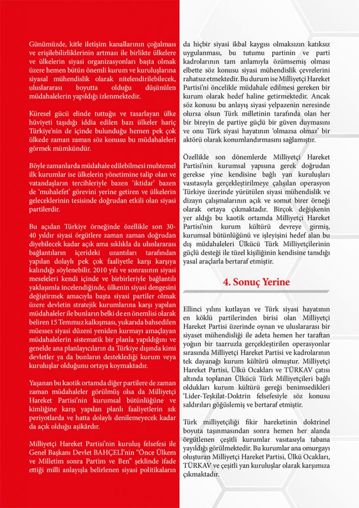 Özellikle son dönemlerde Milliyetçi Hareket Partisi’nin kurumsal yapısına gerek doğrudan gerekse yine kendisine bağlı yan kuruluşları vasıtasıyla gerçekleştirilmeye çalışılan operasyon Türkiye üzerinde yürütülen siyasi mühendislik ve dizayn çalışmalarının açık ve somut birer örneği olarak ortaya çıkmaktadır. Birçok değişkenin yer aldığı bu kaotik ortamda Milliyetçi Hareket Partisi’nin kurum kültürü devreye girmiş, kurumsal bütünlüğünü ve işleyişini hedef alan bu dış müdahaleleri Ülkücü Türk Milliyetçilerinin güçlü desteği ile tüzel kişiliğinin kendisine tanıdığı yasal araçlarla bertaraf etmiştir.