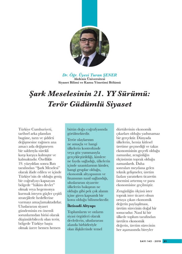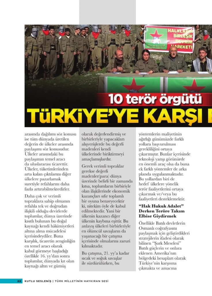 Türkiye Cumhuriyeti, tarihsel arka plandan bugüne, tarzı ve şiddeti değişmesine rağmen ana amacı asla değişmeyen bir saldırıyla sürekli karşı karşıya kalmıştır ve kalmaktadır. Özellikle 19. yüzyıldan sonra Batı tarafından “Şark Meselesi” olarak ifade edilen ve içinde Türkiye’nin de olduğu geniş bir coğrafyayı kapsayan bölgede “hâkim devlet” olmak veya hegemonya kurmak isteyen güçler çeşitli stratejilerle hedeflerine varmayı amaçlamaktadırlar. Uluslararası siyaset gündeminin en önemli sorunlarından birisi olarak düşünülebilecek olan terör, bölgede Türkiye başta olmak üzere hemen hemen bütün doğu coğrafyasında görülmektedir.