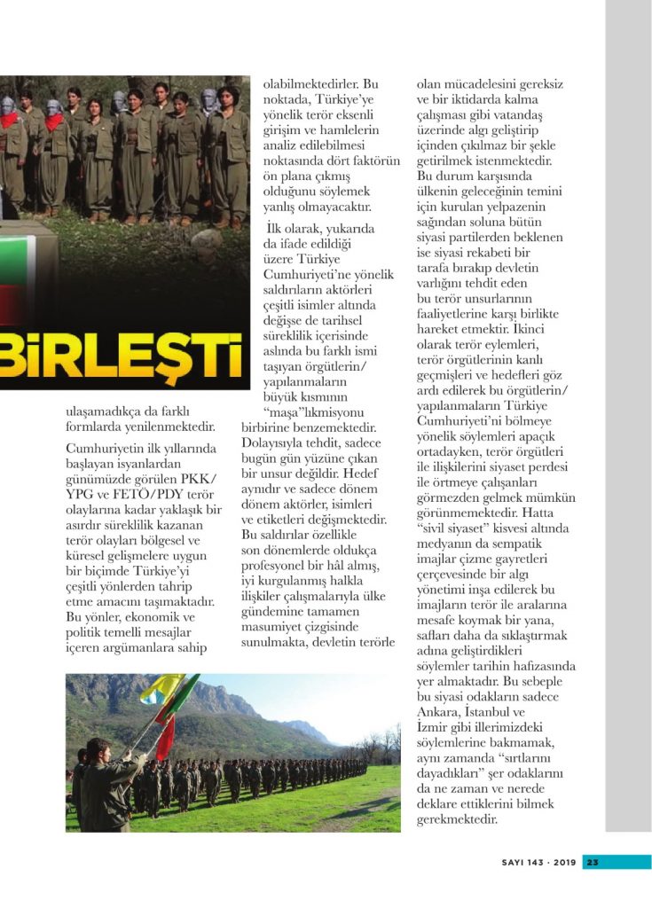 İlk olarak, yukarıda da ifade edildiği üzere Türkiye Cumhuriyeti’ne yönelik saldırıların aktörleri çeşitli isimler altında değişse de tarihsel süreklilik içerisinde aslında bu farklı ismi taşıyan örgütlerin/yapılanmaların büyük kısmının “maşa”lıkmisyonu birbirine benzemektedir. Dolayısıyla tehdit, sadece bugün gün yüzüne çıkan bir unsur değildir. Hedef aynıdır ve sadece dönem dönem aktörler, isimleri ve etiketleri değişmektedir.Bu saldırılar özellikle son dönemlerde oldukça profesyonel bir hâl almış, iyi kurgulanmış halkla ilişkiler çalışmalarıyla ülke gündemine tamamen masumiyet çizgisinde sunulmakta, devletin terörle olan mücadelesini gereksiz ve bir iktidarda kalma çalışması gibi vatandaş üzerinde algı geliştirip içinden çıkılmaz bir şekle getirilmek istenmektedir.Bu durum karşısında ülkenin geleceğinin temini için kurulan yelpazenin sağından soluna bütün siyasi partilerden beklenen ise siyasi rekabeti bir tarafa bırakıp devletin varlığını tehdit eden bu terör unsurlarının faaliyetlerine karşı birlikte hareket etmektir. İkinci olarak terör eylemleri, terör örgütlerinin kanlı geçmişleri ve hedefleri göz ardı edilerek bu örgütlerin/yapılanmaların Türkiye Cumhuriyeti’ni bölmeye yönelik söylemleri apaçık ortadayken, terör örgütleri ile ilişkilerini siyaset perdesi ile örtmeye çalışanları görmezden gelmek mümkün görünmemektedir. Hatta “sivil siyaset” kisvesi altında medyanın da sempatik imajlar çizme gayretleri çerçevesinde bir algı yönetimi inşa edilerek bu imajların terör ile aralarına mesafe koymak bir yana, safları daha da sıklaştırmak adına geliştirdikleri söylemler tarihin hafızasında yer almaktadır. Bu sebeple bu siyasi odakların sadece Ankara, İstanbul ve İzmir gibi illerimizdeki söylemlerine bakmamak, aynı zamanda “sırtlarını dayadıkları” şer odaklarını da ne zaman ve nerede deklare ettiklerini bilmek gerekmektedir.