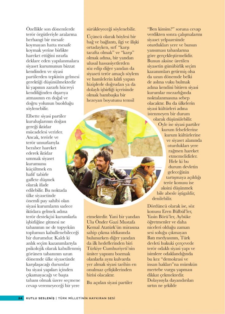 Elbette siyasi partiler kuruluşlarının doğası gereği iktidar mücadelesi verirler. Ancak, terörle ve terör unsurlarıyla beraber hareket ederek iktidar ummak siyaset kurumunu küçültmek en hafif tabirle gaflete düşmek olarak ifade edilebilir. Bu noktada ülke siyasetinde önemli pay sahibi olan siyasi kurumların sadece iktidara gelmek adına terör destekçisi kurumlarla işbirliğine gitmesi ne tabanının ne de topyekün toplumun kabullenebileceği bir durumdur. Kaldı ki anlık seçim kazanımlarıyla psikolojik olarak kabullenmiş görünen tabanının uzun dönemde ülke siyasetinde karşılaşacağı durumlar bu siyasi yapıları içinden çıkamayacağı ve başta tabanı olmak üzere seçmene cevap veremeyeceği bir yere sürükleyeceği söylenebilir.