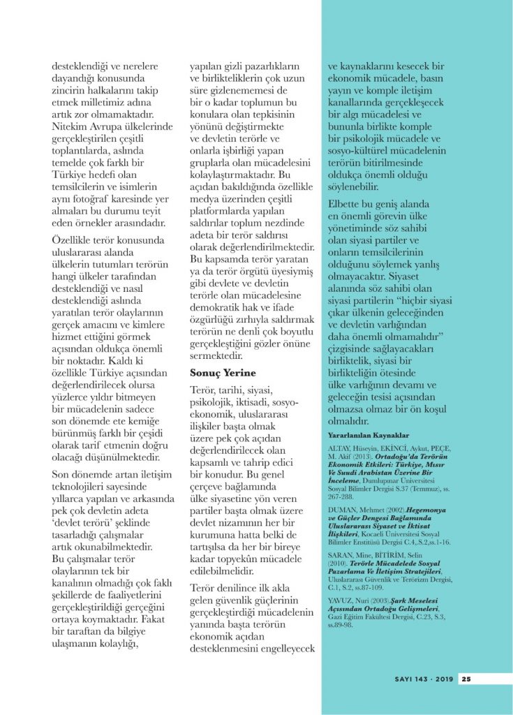 Terör, tarihi, siyasi, psikolojik, iktisadi, sosyo-ekonomik, uluslararası ilişkiler başta olmak üzere pek çok açıdan değerlendirilecek olan kapsamlı ve tahrip edici bir konudur. Bu genel çerçeve bağlamında ülke siyasetine yön veren partiler başta olmak üzere devlet nizamının her bir kurumuna hatta belki de tartışılsa da her bir bireye kadar topyekûn mücadele edilebilmelidir.