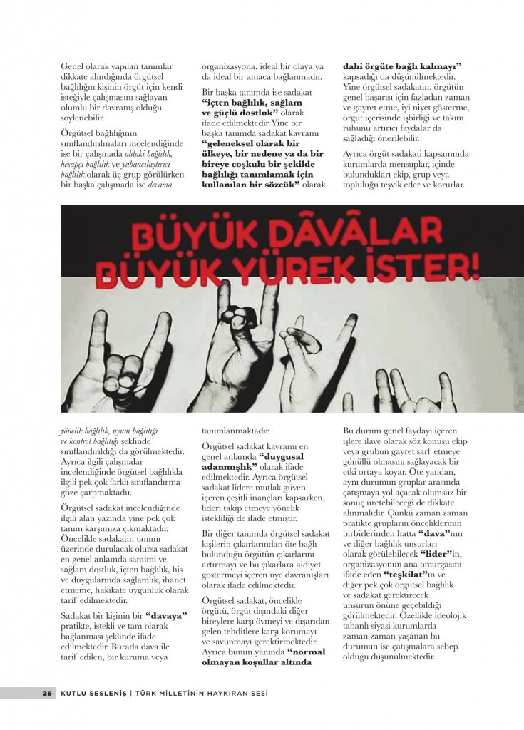 Türkiye’nin taban ve örgütlenme gücü olarak belki de ön önemli kitlesi olarak karşımıza çıkan “Ülkücü Türk Milliyetçileri”nin de siyasi organizasyonlarının hepsinde kurum kültürü ve kurum felsefelerinin en önemli unsurlarının, örgütsel bağlılık ve örgütsel sadakat olarak dolayısıyla da lidere sadakat olarak görülebileceği düşünülmektedir.